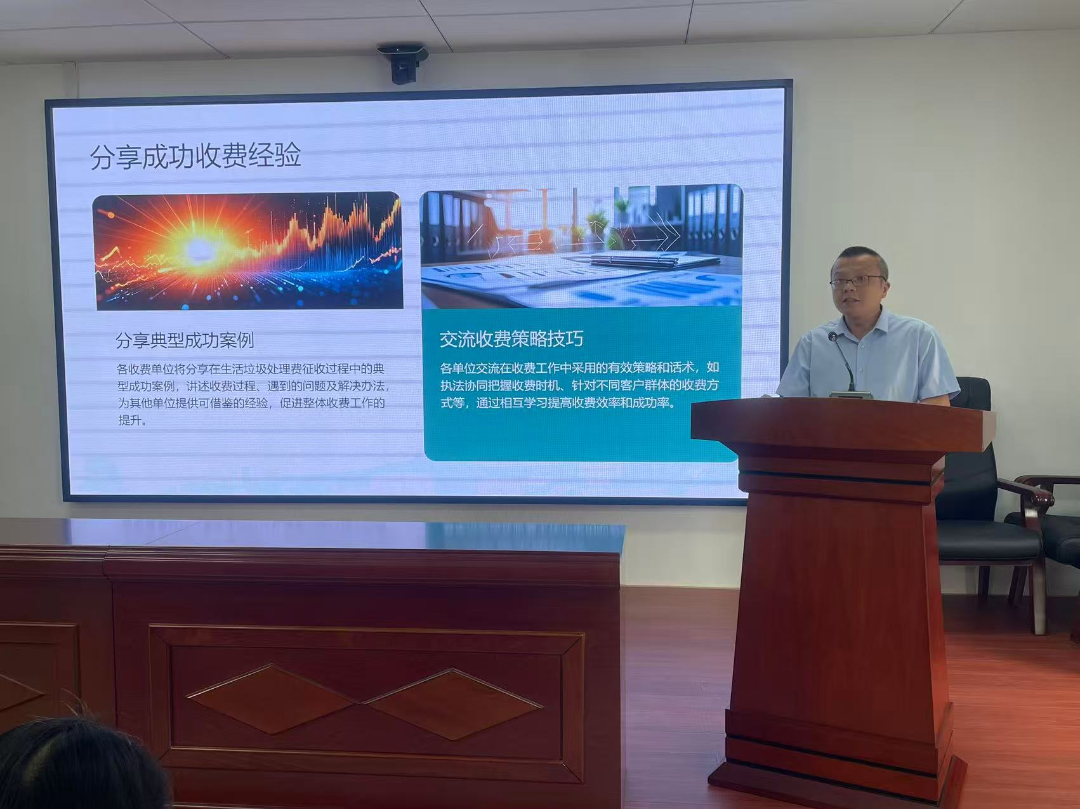 会上,讲解员首先通报了2025年第三季度全市城市生活垃圾处理费收费工作完成的情况;随后,各收费单位围绕生活垃圾处理费征收过程中的典型成功案例进行交流,详细分享收费过程中遇到的各类问题及对应解决办法,为其他单位提供可直接借鉴的实践经验,助力整体收费工作水平提升。各单位通过相互学习借鉴,进一步优化收费工作方法,有效提高全市收费工作的效率与成功率。接着讲解员针对各单位提出的关于系统、票据、报表等问题进行了现场解答,有效解决了实际工作中的疑难问题,为后续收费工作的顺利开展奠定了坚实基础。