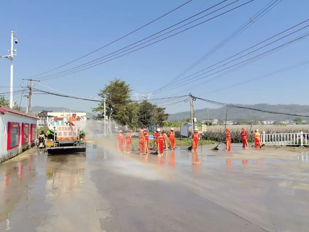 赛道途径各村镇,道路条件复杂,面对这一挑战,柳南环卫所灵活采用“大小结合,人机协同”的战术:宽阔大道由水车进行强力冲洗,还原路面本色;大型车辆无法进入的偏窄小道,则由环卫工人手持水枪,配合小巧灵活的养护车进行深度洗刷,确保整条赛道“路见本色、无死角”。