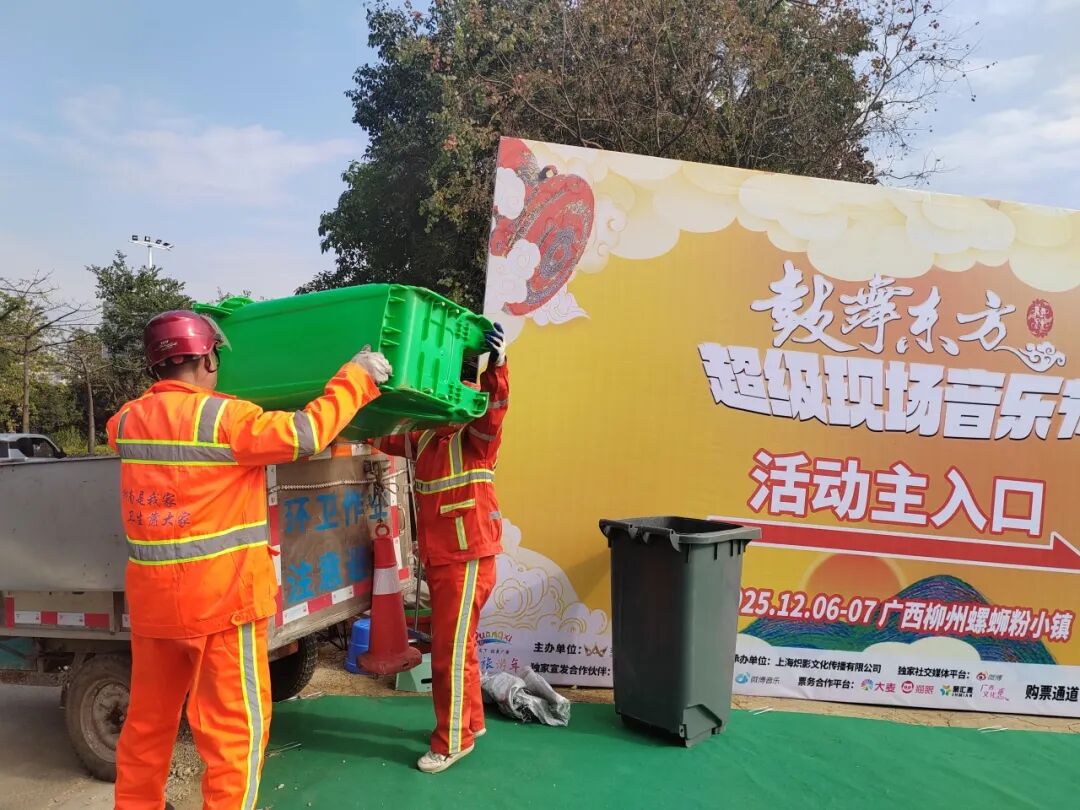 11月30日,在柳南区风景秀丽的螺蛳粉小镇刚刚完成“2025中国辉煌足迹火炬传承跑(柳州站)暨柳州全民健身体育旅游系列活动”,12月6日、7日,同在螺蛳粉小镇,又一场大型活动“鼓舞东方超级现场音乐节”紧接着开场。冬日暖阳下,成千上万的乐迷在美美享受一场超级音乐盛会的同时,柳南美丽的山水、洁净的环境,也留给了他们难忘的印象,有乐迷说更忘不了那些不时晃动在眼前的橙红色的身影——默默劳作的柳南环卫工人。