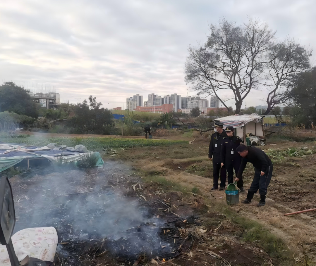 紧盯露天焚烧,筑牢安全防线。露天焚烧秸秆、干草等废弃物,既污染空气又存在消防隐患。执法局加密城郊等重点区域巡查,强化早晚时段管控,确保焚烧行为“早发现、早制止、早处置”。12月15日,执法人员单日就制止并扑灭焚烧秸秆火点4处,同步开展宣传教育104余起;12月16日持续加码,处置火点7处、开展宣传60余起,还在辖区新增悬挂“倡导文明出游,严禁露天焚烧”宣传横幅10条,通过宣讲禁烧政策与案例,多维度营造浓厚宣传氛围,让“禁烧护蓝”理念深入人心。