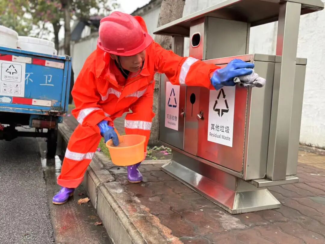 日常管护中,梁榜文还养成了“巡查+保洁”一体的工作习惯,将责任落实到每一处细节。作业时,他都会仔细检查果皮箱的锁扣、内胆、箱体的完好情况,发现损坏、松动等问题及时上报维修,保障设施正常使用;遇到市民随手丢弃在箱外的垃圾,他会主动拾起放入箱内,面对不文明行为,始终耐心劝导,积极引导。“看到梁师傅天天这么认真,我们也得自觉爱护环境。”辖区居民说。