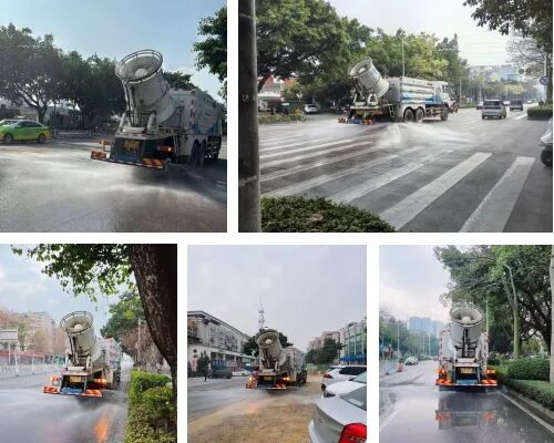 图为炮雾车对荣军路、蝴蝶山路进行洒水除尘作业