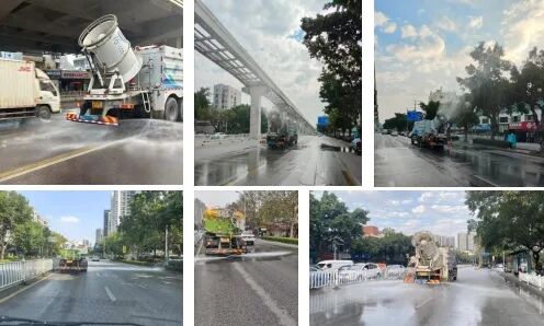 图为洒水车、炮雾车对燎原路、荣军路进行冲洗作业
