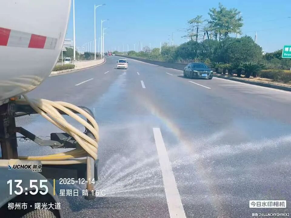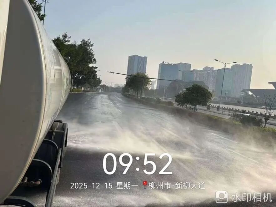 自今年11月秋冬季大气污染防治攻坚战打响以来,鱼峰区综合行政执法局迅速进入攻坚备战模式,以主动防控的姿态统筹推进污染防治。通过将日常保洁、洒水降尘与污染天气预警响应机制紧密结合,织密了全方位的大气防护网。整合片区6家环卫保洁公司作业力量,组建起一支全天候环卫队伍,实现人员与机械高效配合,在柳东主干道及重点区域开展不间断洒水保湿与清扫保洁,确保抑尘除尘无空档。
