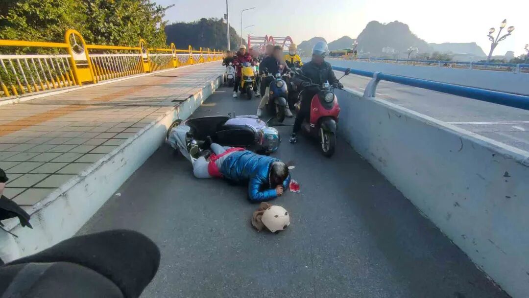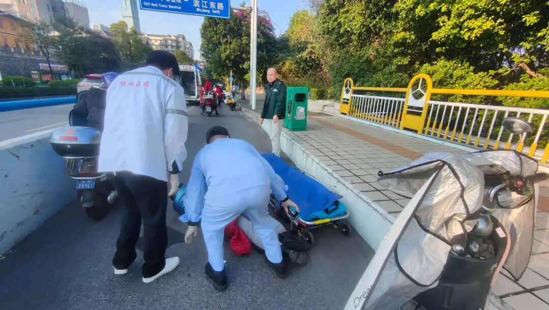 1月6日下午5时左右,执法队员邓金祎在例行巡查经过文惠桥路口时,发现文惠桥东侧非机动车道上有人倒地。他立即上前查看,发现道路中间一辆电动车侧翻在地,一位头发花白的市民双脚搭在电动车、脸朝下趴在地上,伤情不明,一个沾满鲜血的口罩和一个头盔散落在身边。