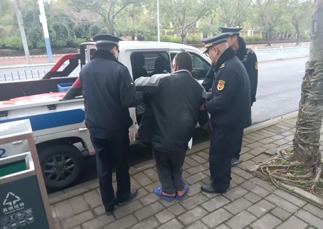 1月22日上午10时左右,柳州气温低迷,寒意袭人。在城中区高新五路,一名男子赤脚穿着拖鞋,独自蜷缩在冰冷的人行道边。这一情况很快被巡查经过该处的城中区综合行政执法局队员发现。