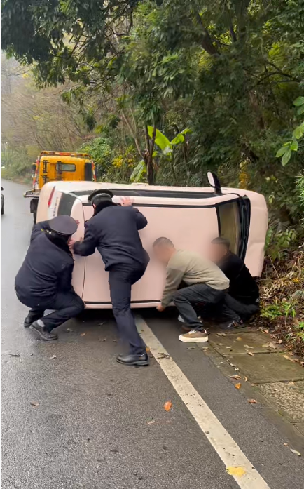 1月21日上午,在环江滨水大道上,一辆新能源小汽车意外侧翻在路边。巡逻至此的执法队员立即停车上前,查看车内情况。确认人员安全后,他们迅速分工协作:有人指挥交通,有人则与车主合力将车辆扶正,并推移至安全位置,整个过程仅用了几分钟。