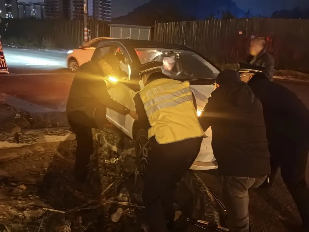 同日晚9时许,在中环路与环江滨水大道交汇处,一辆汽车因驾驶员操作不慎,右轮陷入路边坑中无法移动。恰巧巡查至此的执法队员见状,毫不犹豫地撸起袖子便上前帮忙。几人分工配合,一人用木棍垫起车轮,两人俯身抵住车尾,随着一声“一、二、三——推!”,车辆终于成功脱困。车主摇下车窗,抱拳连声道谢:“太感谢你们了,这么晚还麻烦你们!”