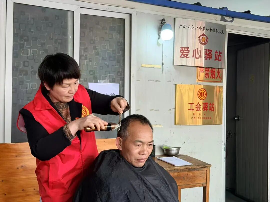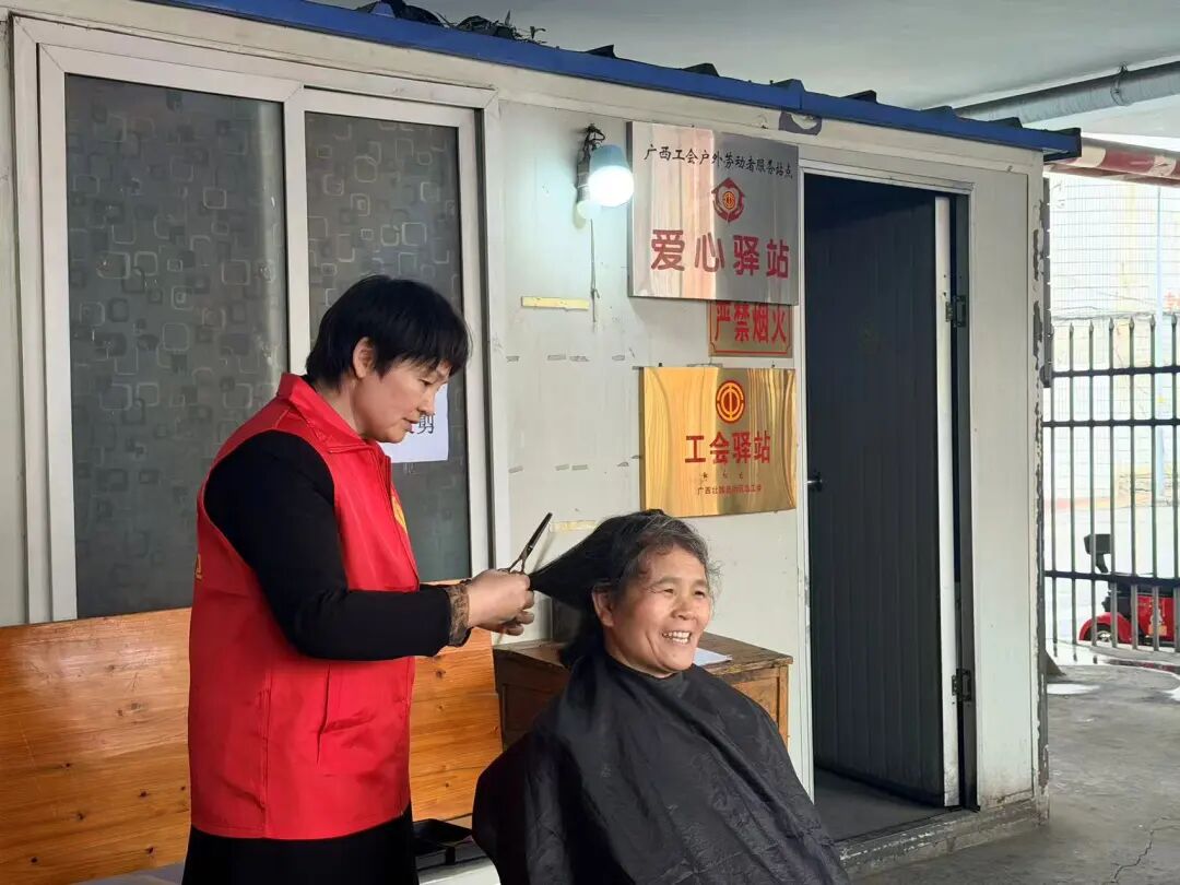 为切实解决一线环卫职工的急难愁盼小事,进一步增强团队凝聚力、向心力,筑牢职工的归属感与幸福感,柳南区环卫所组建了党员干部志愿服务队,推出“暖心义剪”常态化服务项目——每月定期下沉到辖区各工会驿站、环卫休息室,为起早贪黑的一线环卫职工提供免费理发服务,把贴心服务直接送到职工的“工作点门口”。