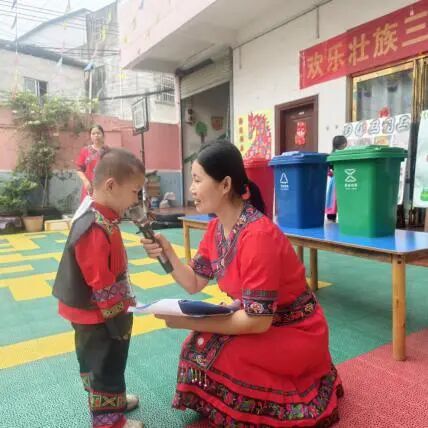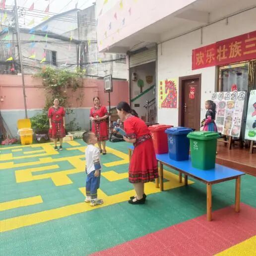 活动现场,五彩三角旗迎风飘扬,壮锦纹样展板、“三月三歌圩节”主题海报错落布置,浓浓的壮乡节庆氛围扑面而来。全体师生身着色彩鲜艳、绣工精美的壮族传统服饰,以沉浸式体验开启这场文化与环保的双向奔赴。活动以趣味互动为核心,将垃圾分类知识融入民族节庆游戏中:工作人员化身“环保宣传员”,通过生动讲解、现场演示、互动问答等形式,向孩子们详细介绍可回收物、厨余垃圾、有害垃圾、其他垃圾的分类标准与投放要求;设置四色分类垃圾桶实操区,让孩子们亲手将垃圾卡片投入对应桶内,在实践中巩固分类知识;通过一对一采访、趣味闯关等环节,引导孩子们主动分享环保心得,让垃圾分类理念入脑入心。