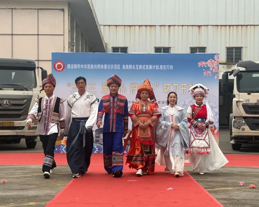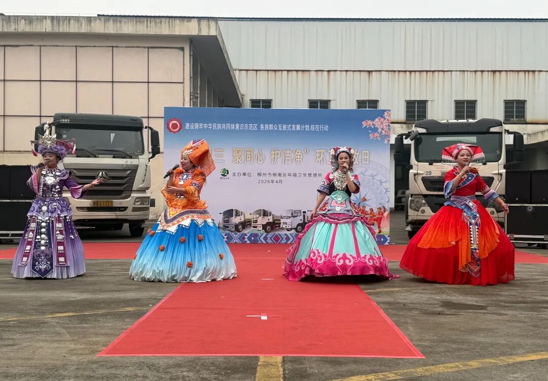 现场歌声飞扬、欢声阵阵,一派民族团结的热闹景象,此次活动以“民族团结一家亲,同心共护洁净城”为核心,既是广西三月三民族文化传承盛宴,也是面向群众的环卫开放展示会。平日里坚守街头的环卫工人们,换上绚丽的壮锦、苗绣等民族盛装,壮、汉、苗、侗等各族职工携手联动,用自编山歌、民俗体验、环卫展示,共庆佳节,让民族情与环卫心温暖交融。
