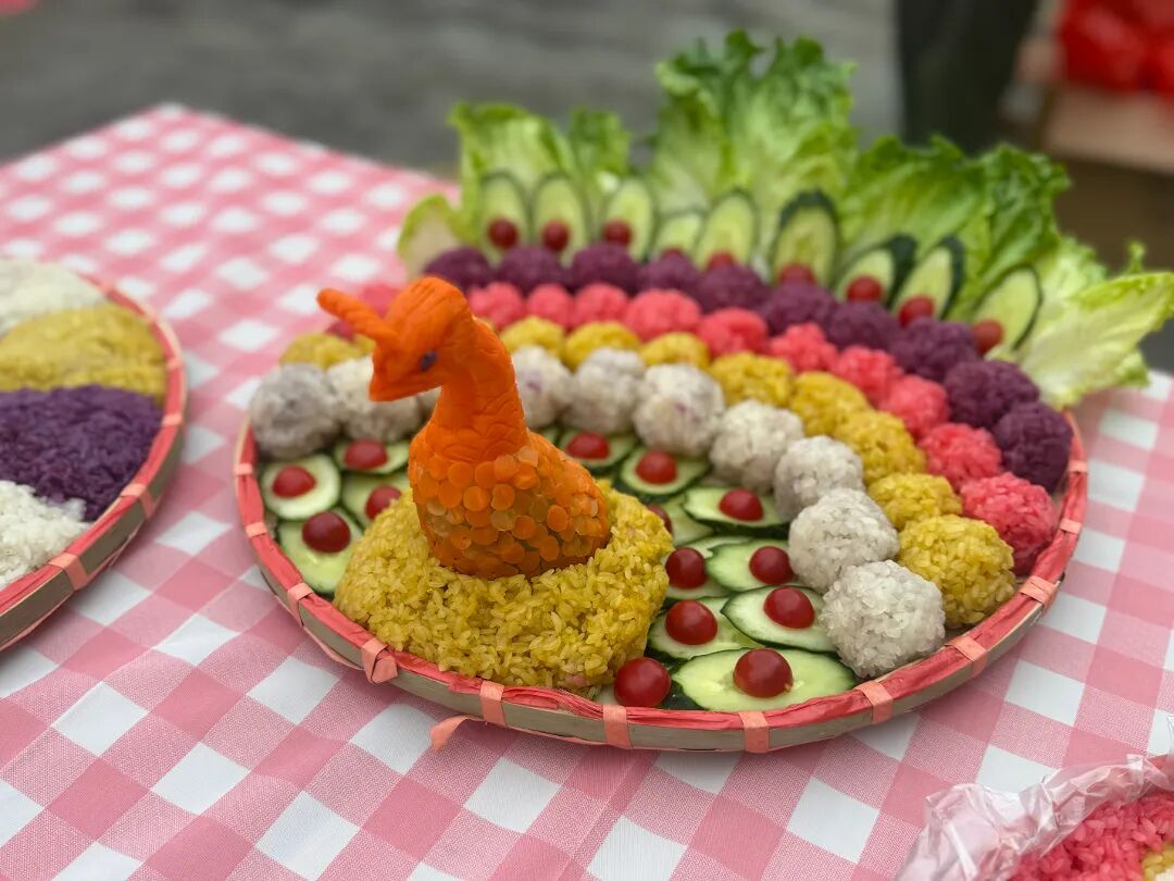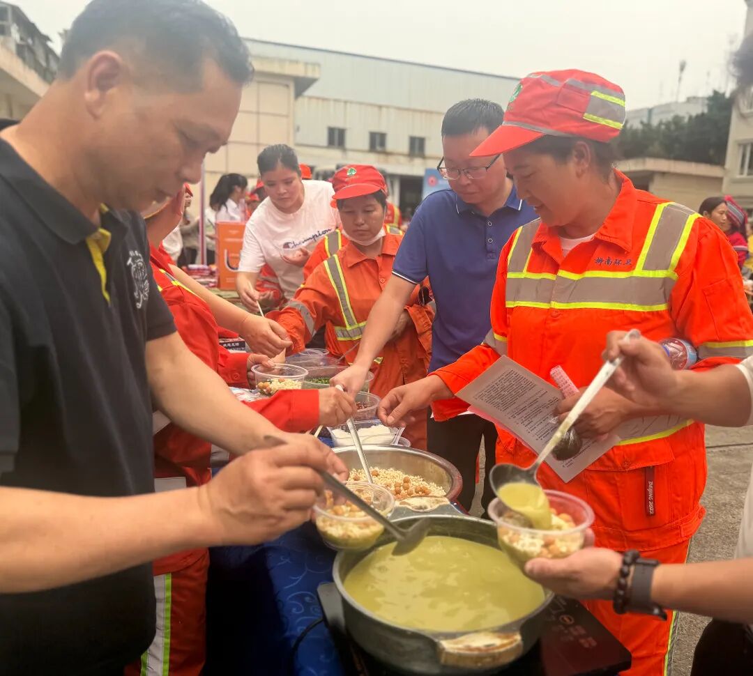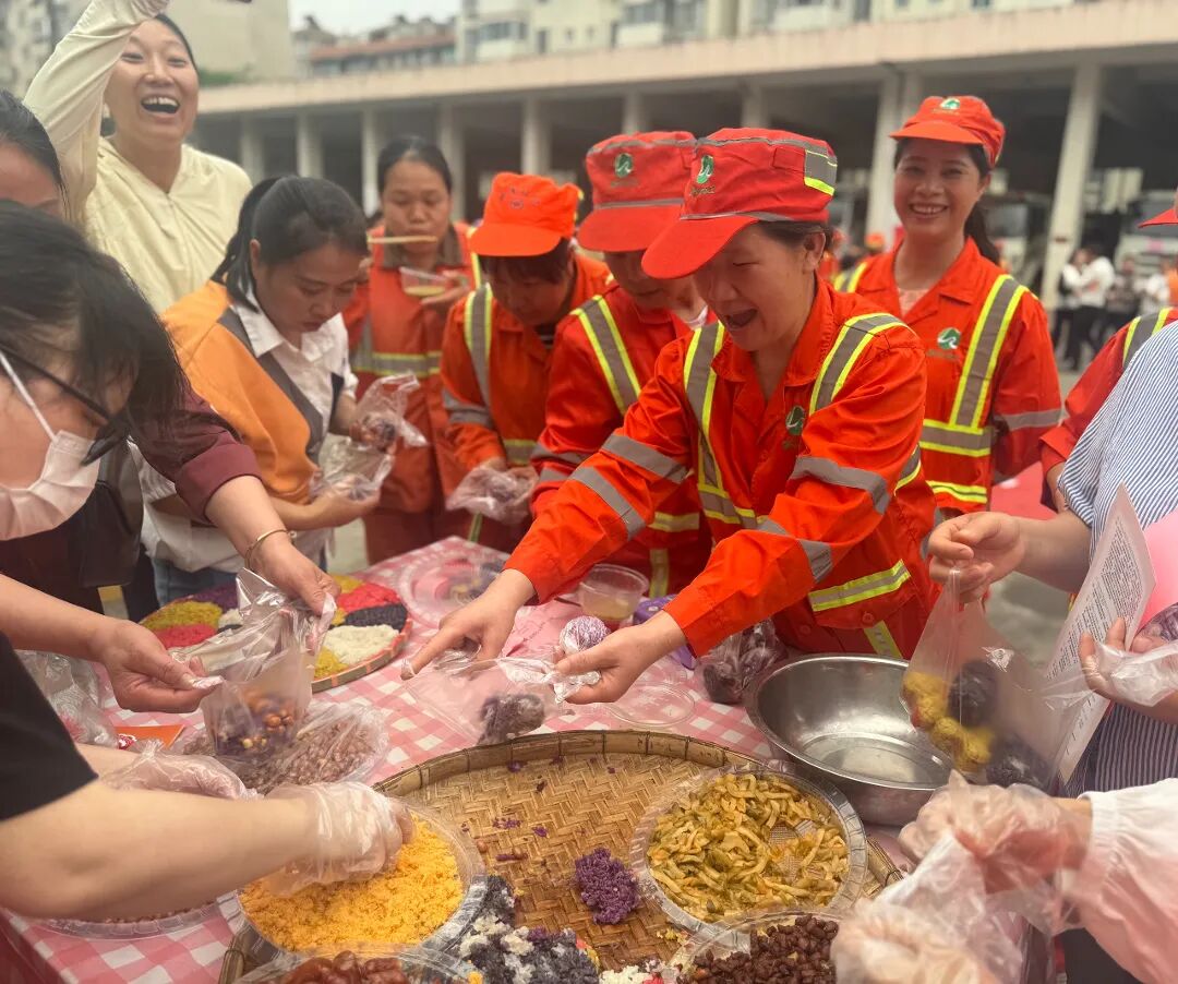 文艺表演落幕后,民俗体验与环卫展示同步开启,现场化身“民族团结民俗集市”与环卫“实景课堂”。绣球编织、五色糯米饭蒸制等体验区前,各族群众踊跃参与、相互请教,不少群众将祝福绘在彩蛋上,在感受壮乡文化的同时,体会环卫工作的平凡与伟大。