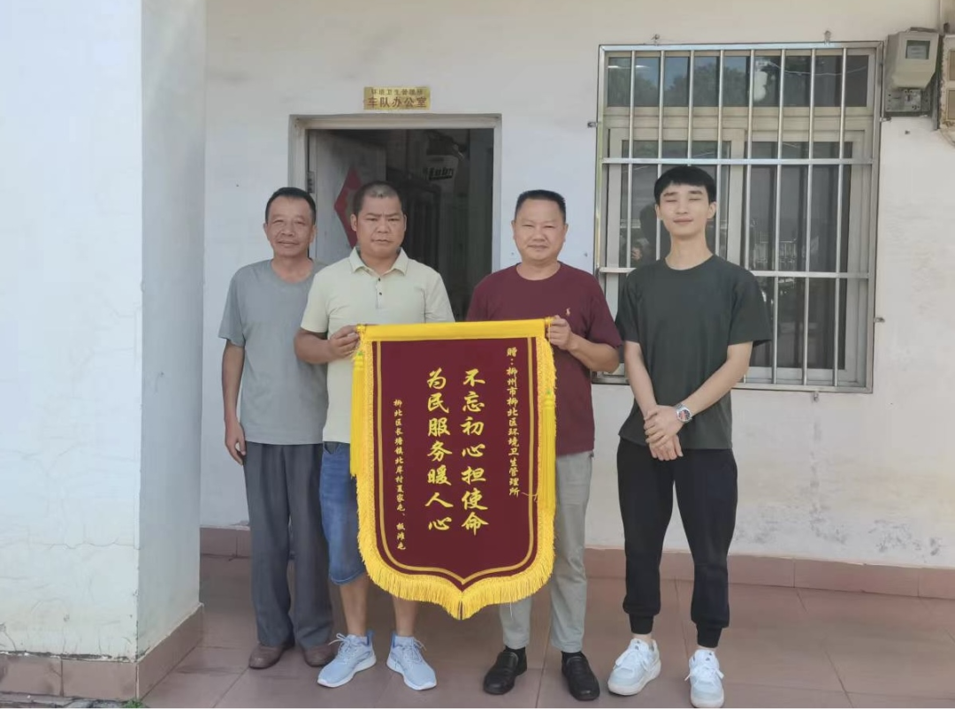 7月16日,柳北区长塘镇北岸村夏家屯、板滩屯的村民代表给柳北区环卫所送去一面写有“为民服务暖人心”等内容的锦旗,向该所工人表示感谢。