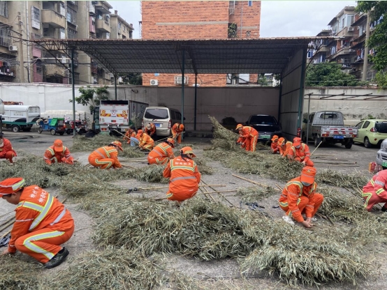 首先进行的是集体项目扎扫把,扫帚是环卫人日常作业的基础工具,也最考验环卫人的基本功,扫帚扎的好不好,直接影响日常普扫工作的有效开展,在短时间内通过牢固、密度、厚度、外观、规范等工序将零散的扫把丝和扫把杆进行完美结合,才能呈现出一把美观牢固的扫帚。