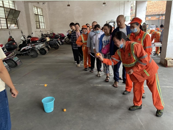 集体项目结束后,就到了大家最喜欢的游园趣味活动环节,活动包括运垃圾分类知识问答、乒乓球、趣味投球、盲人敲钟、夹弹珠、套圈圈等项目,内容多样,礼品丰富。活动中,往日忙碌在工作一线的环卫工人,在场上也是活力四射,展现出城市美容师的勤劳和勇敢的精神面貌。