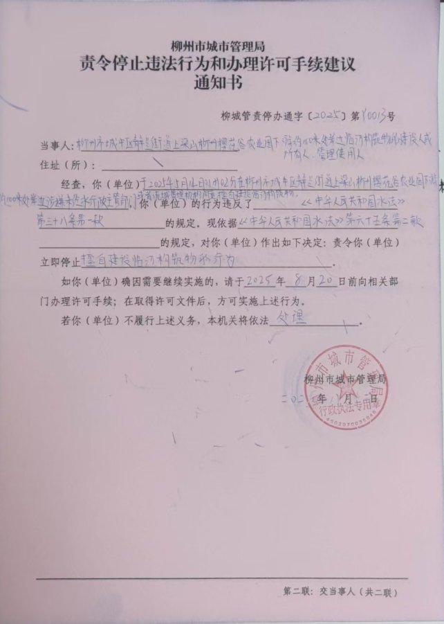 附:《责令停止违法行为和办理许可手续建议通知书》(柳城管责停办通字〔2025〕第Y0013号)
