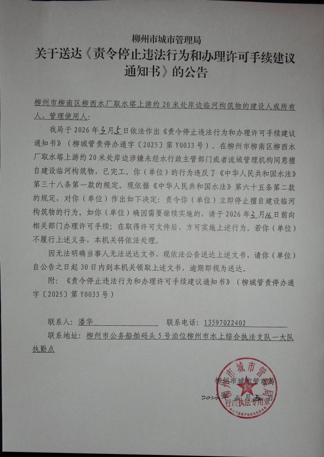 我局于2026年3月5日依法作出《责令停止违法行为和办理许可手续建议通知书》(柳城管责停办通字〔2025〕第Y0033号)。在柳州市柳南区柳西水厂取水塔上游约20米处岸边涉嫌未经水行政主管部门或者流域管理机构同意擅自建设临河构筑物,已完工。你(单位)的行为违反了《中华人民共和国水法》第三十八条第一款的规定。现依据《中华人民共和国水法》第六十五条第二款的规定,对你(单位)作出如下决定:责令你(单位)立即停止擅自建设临河构筑物的行为。如你(单位)确因需要继续实施的,请于2026年3月16日前向相关部门办理许可手续;在取得许可文件后,方可实施上述行为。若你(单位)不履行上述义务,本机关将依法处理。