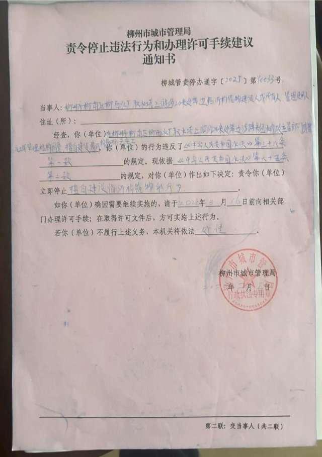 附:《责令停止违法行为和办理许可手续建议通知书》(柳城管责停办通字〔2025〕第Y0033号)