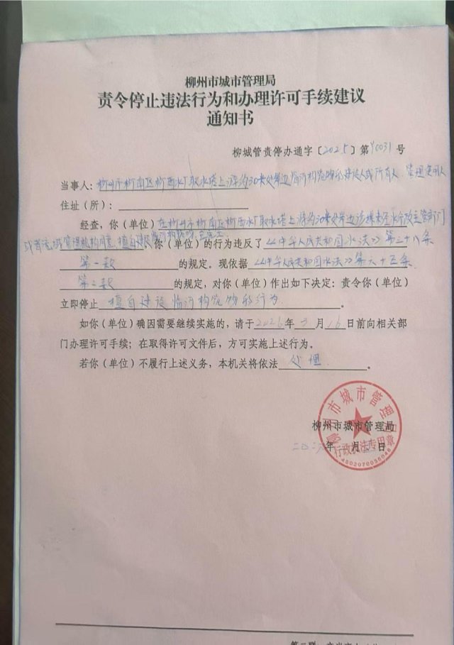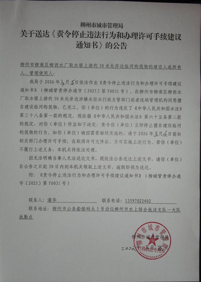 我局于2026年3月5日依法作出《责令停止违法行为和办理许可手续建议通知书》(柳城管责停办通字〔2025〕第Y0031号)。在柳州市柳南区柳西水厂取水塔上游约30米处岸边涉嫌未经水行政主管部门或者流域管理机构同意擅自建设临河构筑物,已完工。你(单位)的行为违反了《中华人民共和国水法》第三十八条第一款的规定。现依据《中华人民共和国水法》第六十五条第二款的规定,对你(单位)作出如下决定:责令你(单位)立即停止擅自建设临河构筑物的行为。如你(单位)确因需要继续实施的,请于2026年3月16日前向相关部门办理许可手续;在取得许可文件后,方可实施上述行为。若你(单位)不履行上述义务,本机关将依法处理。