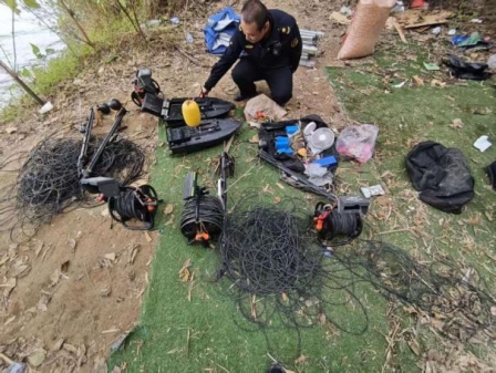 近日,柳州市水上综合执法支队在巡查至官塘大桥上游右岸约600米处时,发现有一处遮阳棚下藏着4台水下可视射鱼器、2艘遥控船及一批用于非法捕鱼的打窝饵料。执法队员当即对现场涉案工具进行处置,避免了一起破坏柳江水域生态行为。