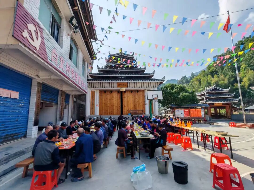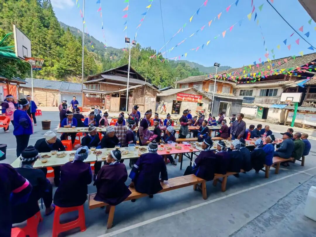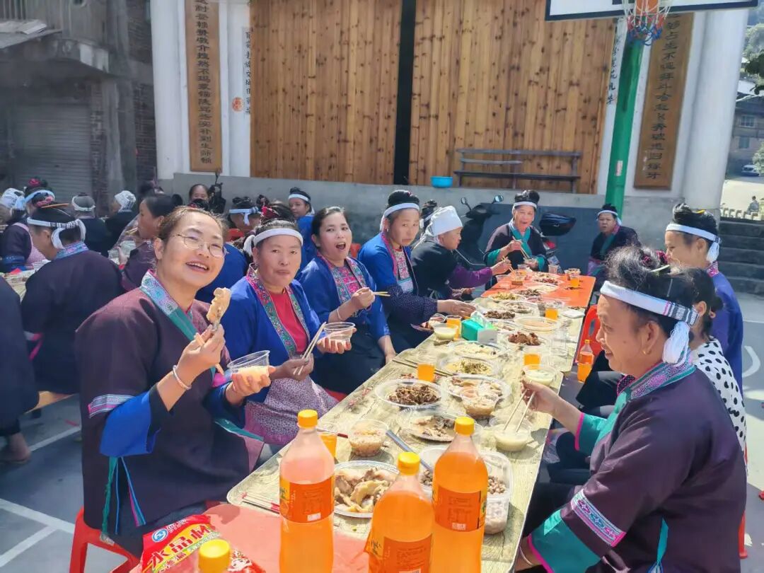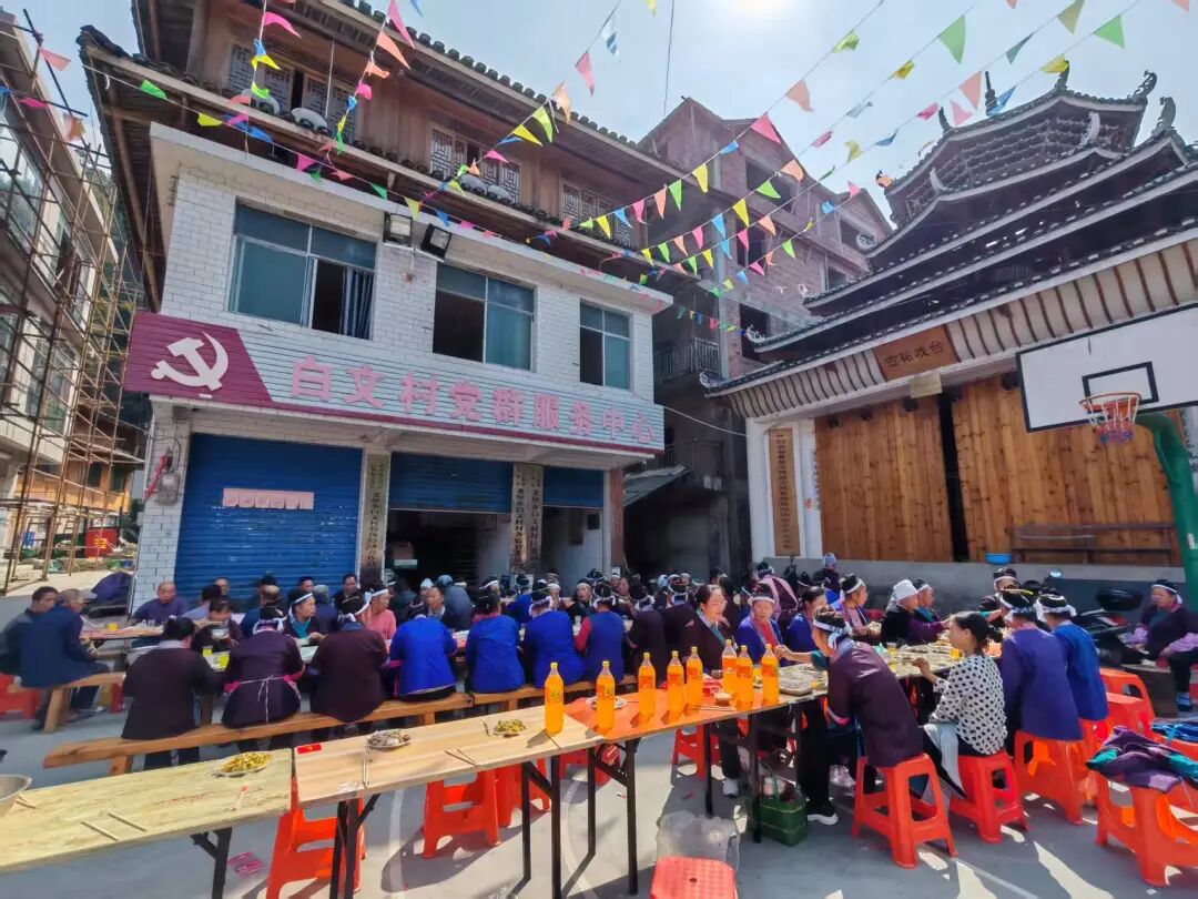 活动当天,白文村处处洋溢着喜庆的氛围,广场上彩旗飘扬,古柘戏台与周边极具民族特色的建筑交相辉映。村“两委”和驻村工作队早早便开始筹备,从食材的采购、菜品的制作到场地的布置,每一个环节都凝聚着对老人的贴心关怀。中午时分,老人们身着民族服饰,欢聚一堂。长长的餐桌上摆满了各式各样的美味佳肴,既有村民们精心烹制的家常菜,也有极具地方特色的风味小吃,香气四溢,令人垂涎。大家围坐在一起,一边品尝着百家宴的美味,一边拉家常、话邻里,脸上洋溢着幸福的笑容。现场欢声笑语不断,浓浓的敬老爱老之情在空气中流淌。
